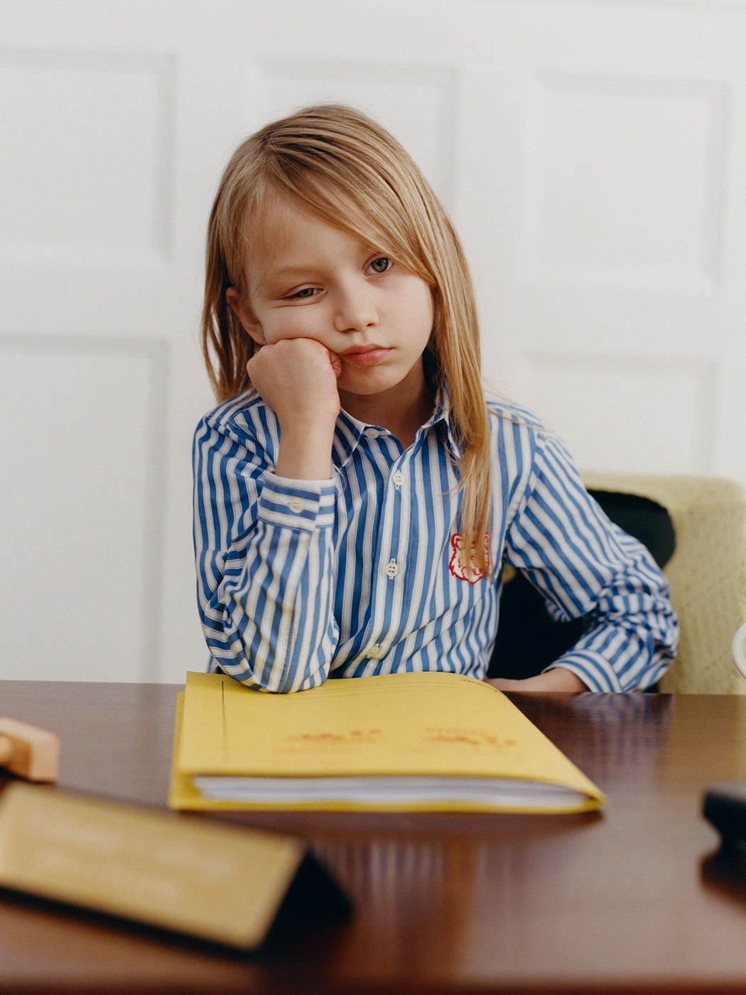 从经典制服元素出发,红色刺绣图案为经典蓝白条纹衬衫和连衣裙赋予活力,小狐狸印花跃然衣间,为棉质T恤增添灵动趣味,孩子们在Bonpoint与Maison Kitsuné 描绘的童趣场景中专注思考、自在探索,让学院时光充满纯真想象。