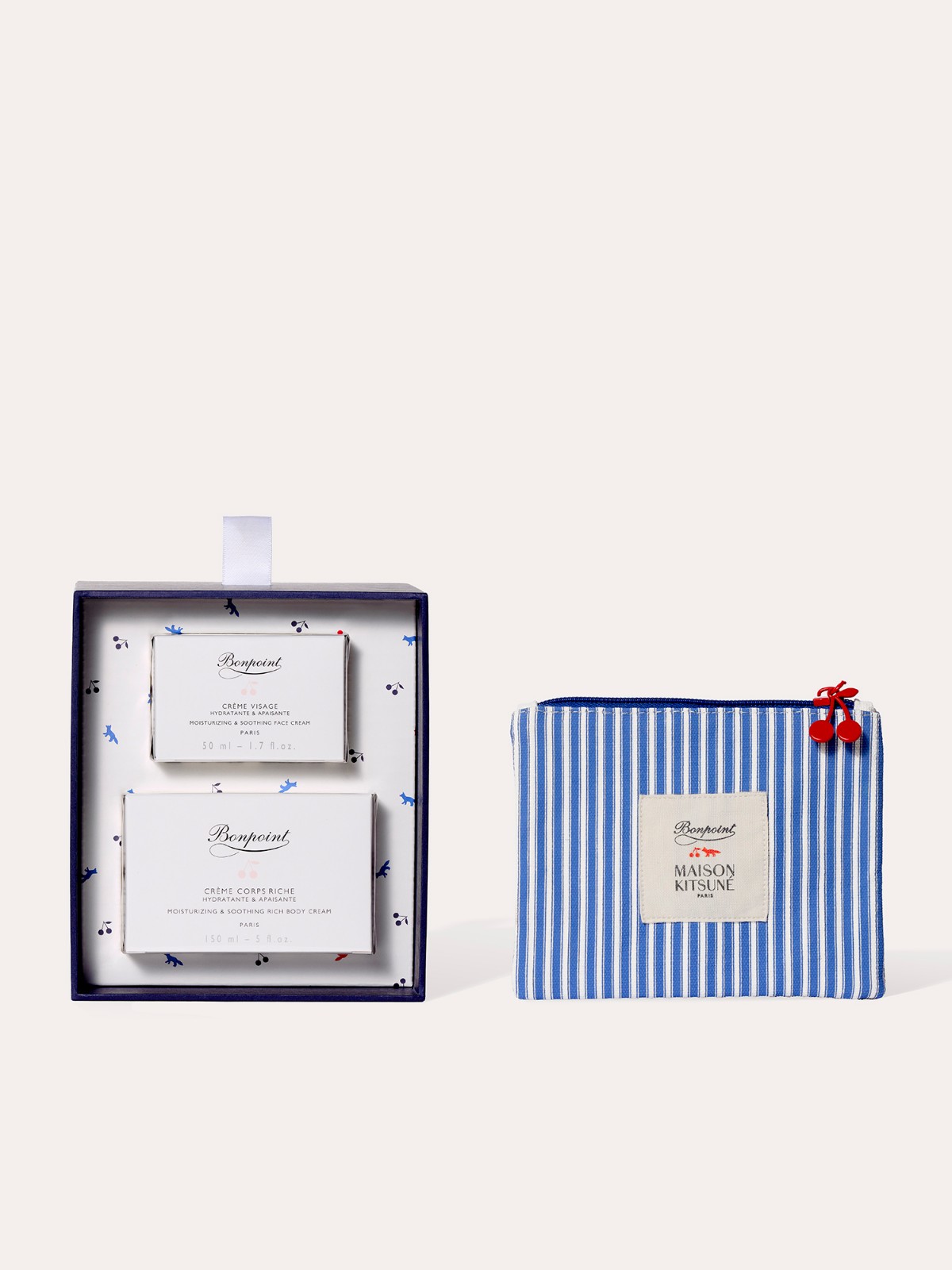 此次合作亦推出Bonpoint x Maison Kitsuné限定版挚爱护肤礼盒,甄选小樱桃挚爱面霜与小樱桃挚爱身体乳霜,并以专属包装呈现,在温和纯净的护肤体验中延续Bonpoint一贯的细腻呵护。