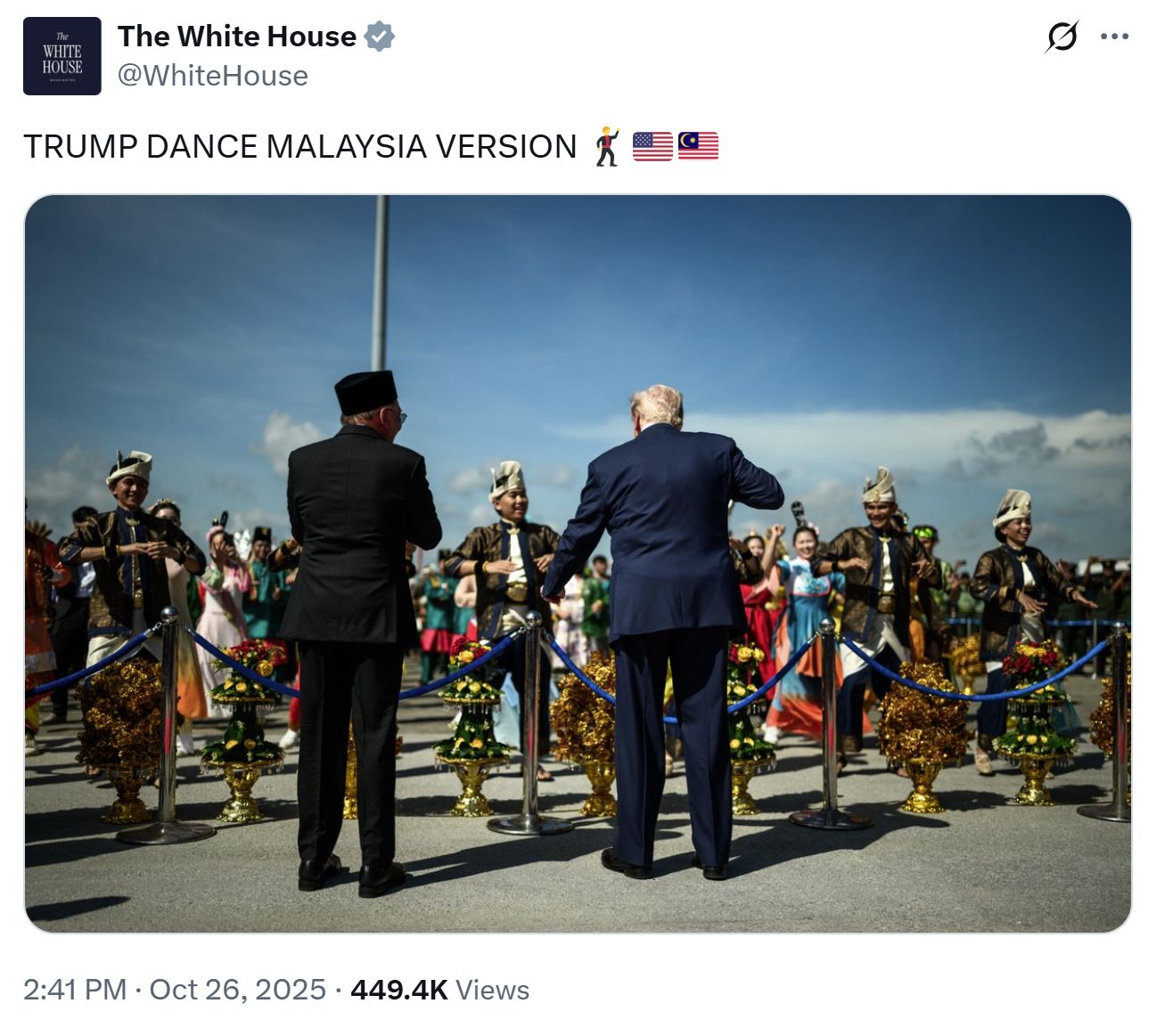 视频显示,这名79岁的总统刚刚乘坐“空军一号”从华盛顿特区历经23小时飞行抵达吉隆坡后,便随着鼓点挥拳起舞。视频中,马来西亚总理安瓦尔·易卜拉欣(Anwar Ibrahim)也随着音乐轻轻摇摆。特朗普与代表马来西亚主要族群的表演者一同起舞,这些族群包括婆罗洲的原住民,以及马来人、华人和印度人。白宫在社交媒体上将他的舞步称为“特朗普舞·马来西亚版”(“TRUMP DANCE MALAYSIA VERSION”)。这场表演是马来西亚总理安瓦尔·易卜拉欣为欢迎特朗普特别安排的迎宾仪式的一部分。