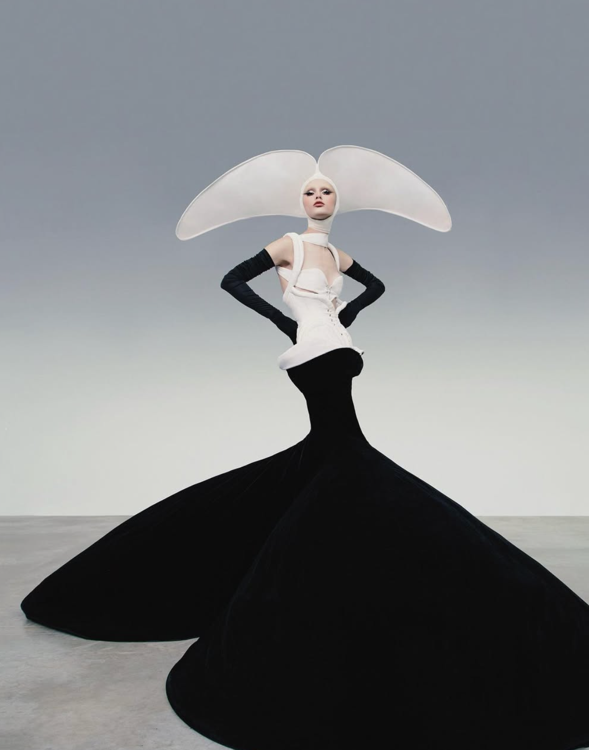 2024年,他的服装也出现在挑衅性流行歌手恰贝尔·罗恩(Chappell Roan)身上。那年8月在艾奥瓦州的Hinterland音乐节演出时,她身穿“飞行修女”(Flying Nun)套装:传统修女头巾搭配刘易斯的丝绸水纹紧身胸衣(配增强的臀部结构)、丝绒心形裙与透明黑色外套。“我喜欢玩弄幻觉式穿衣的概念,创造一些能扭曲穿着者身体现实的东西,通过夸张造型与束腰来打造轮廓。这是一种我一直被吸引的‘严厉之美’。”刘易斯解释说。毫不意外,他锋利的品味也吸引了亚文化圈,例如他曾为先锋摇滚音乐人伊夫斯·涂沫(Yves Tumor)打造了2023年专辑《Heaven Surrounds Us Like a Hood》中的葬礼帽。那顶帽子由高耸的羽毛制成,使涂沫看起来像一只从乌鸦群中独自离去的孤鸦。
