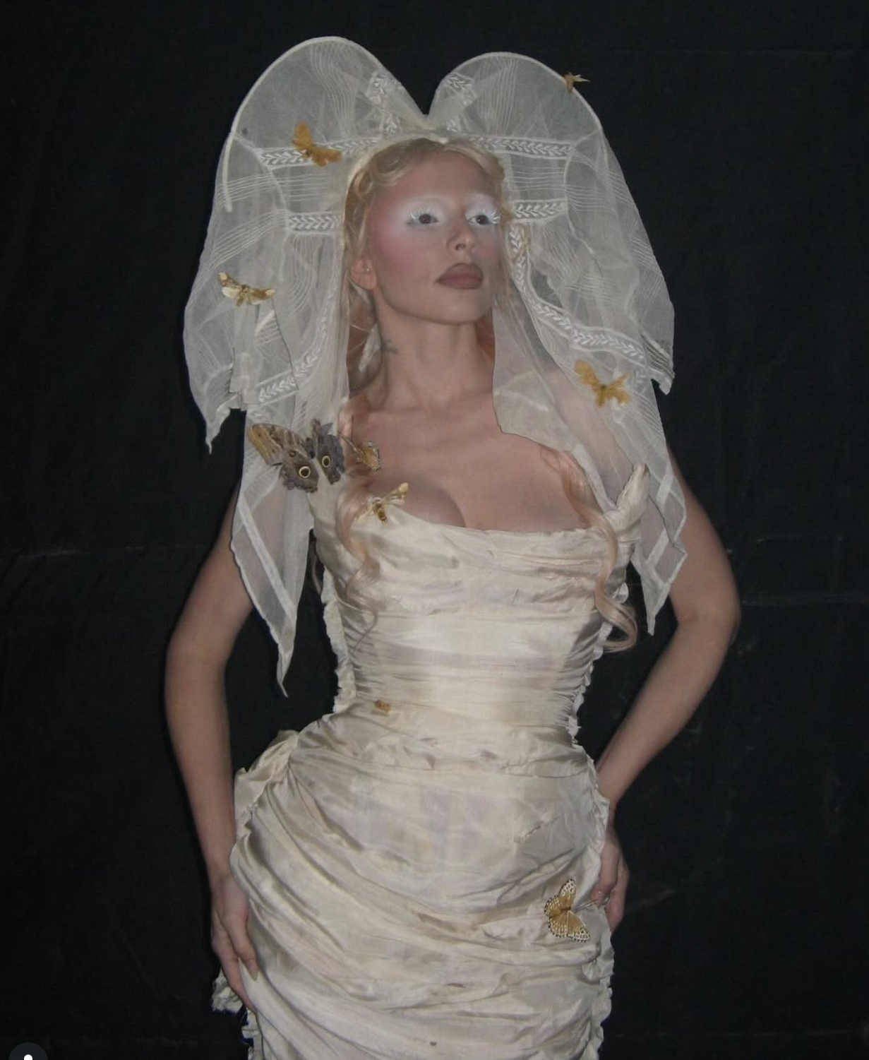 这名年轻设计师“深受电影、历史,以及20世纪50至60年代高级定制大师轮廓的影响”。在佛罗伦萨求学期间,他经常前往博物馆与古董市场寻找灵感。“我一直努力将历史物件与可辨认的视觉引用,通过我的设计重塑为现代语言。”他说。他的审美判断也渗透在他为意大利-美国籍演员茱莉亚·福克斯(Julia Fox)打造的造型中。福克斯在 2024年5月真人秀时尚竞技节目《OMG FASHUN》的季终集中担任主持人。刘易斯为她定制了一件超现实主义婚纱,主体由破碎的蚕丝碎片悬垂在身上,仿佛是来自巴黎古董市场的蝴蝶标本一般。整体造型搭配了一条由18世纪披肩改制的蕾丝头纱,令人难以忘怀。