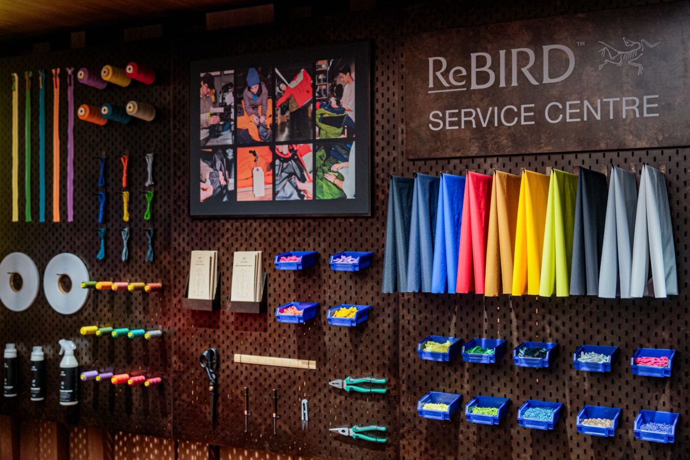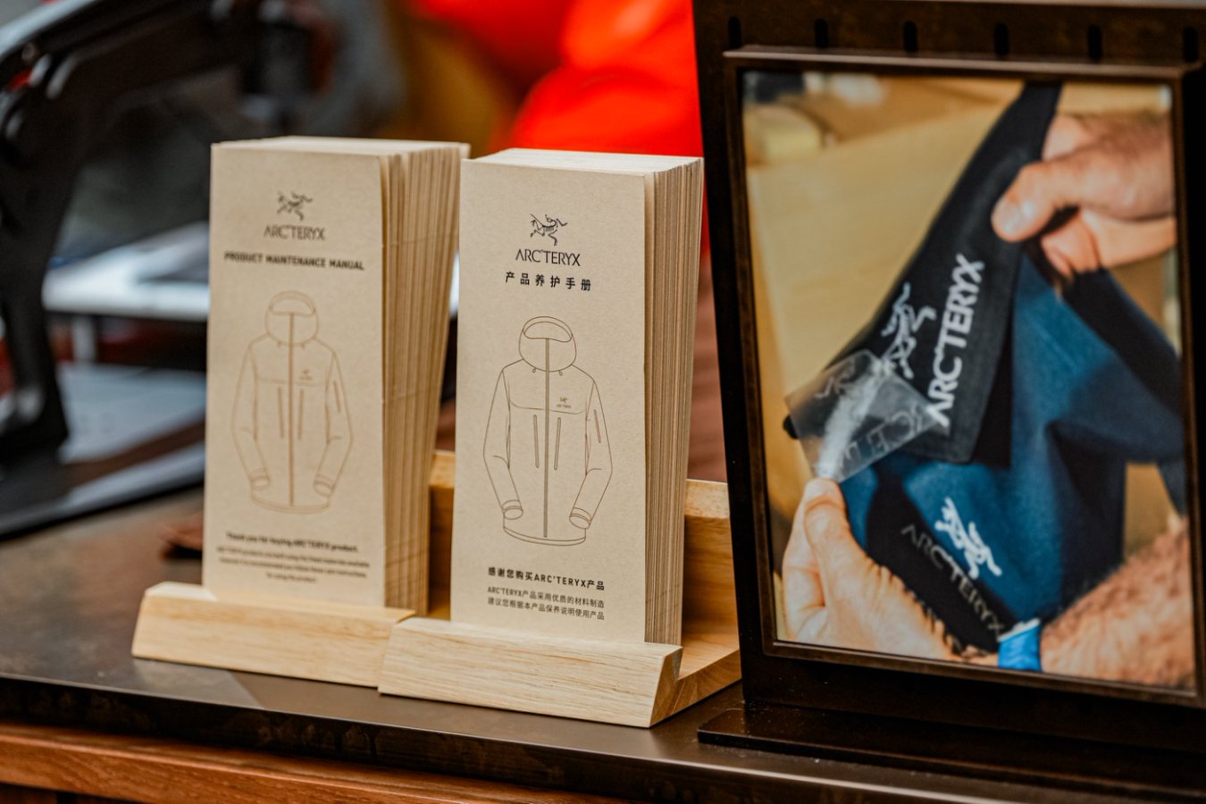 ARC'LOUNGE拥有北京第二家ReBIRD™重生工坊。工坊墙面上清晰展示了一件始祖鸟产品“重生”的完整流程及所需工具,最引人注目的,莫过于右上角陈列的始祖鸟标志性产品Alpha SV——经过精心修补后,其呈现出独一无二的“缝补艺术”。用户可在此进行质保鉴定、配件挑选、即时维修乃至专业养护,显著延长产品的使用寿命与性能。