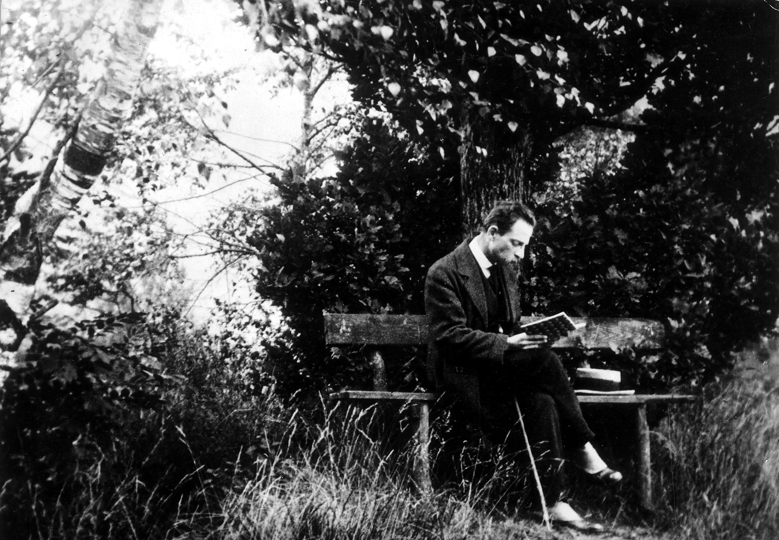 △1913年,里尔克在黑森林里波尔德绍公园的一张长椅上。